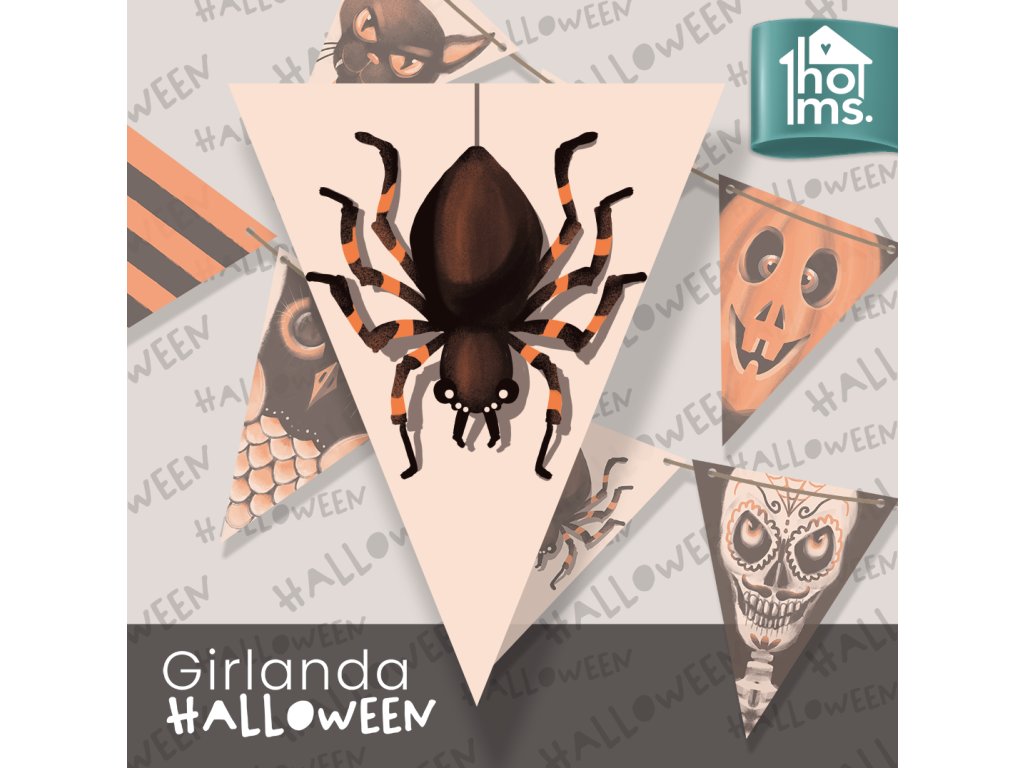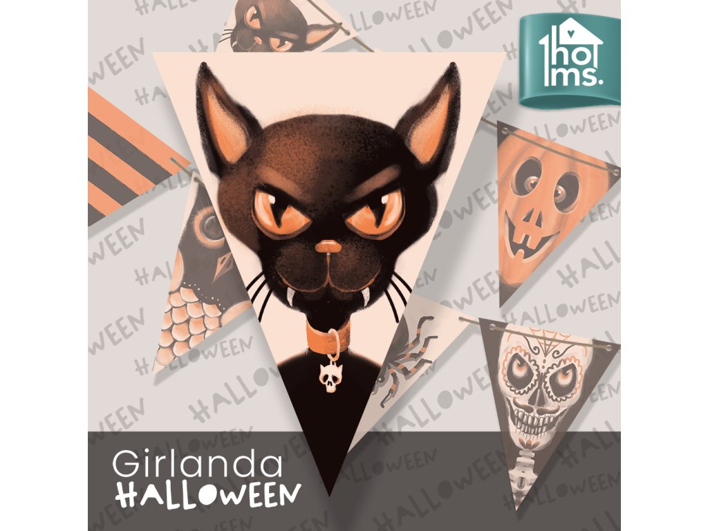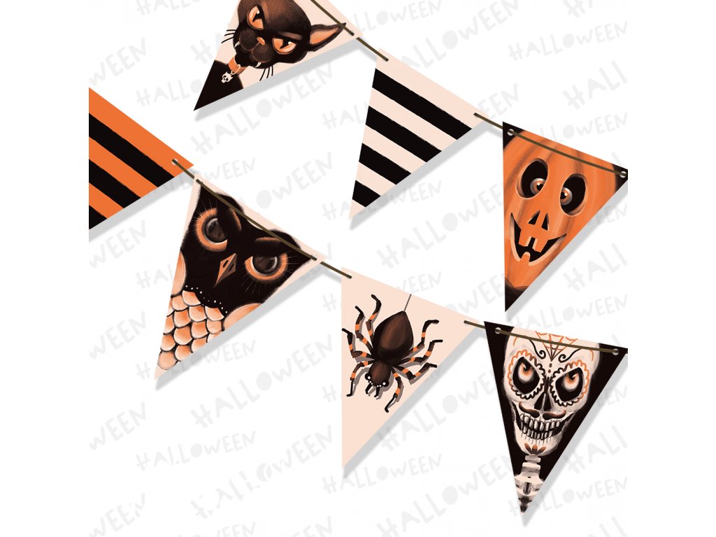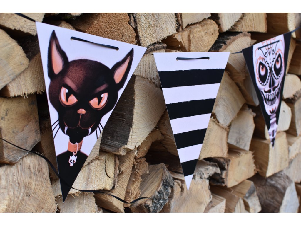 Originální vlaječková girlanda k dekoraci interiéru. Girlanda je vyrobena z papíru, vlaječky jsou oboustranně potištěné. Girlanda má 7 vlaječek. Vlaječka je 24cm dlouhá a 19cm široká. Je dodávána s černou saténovou šňůrkou k provlečení o délce 5m.